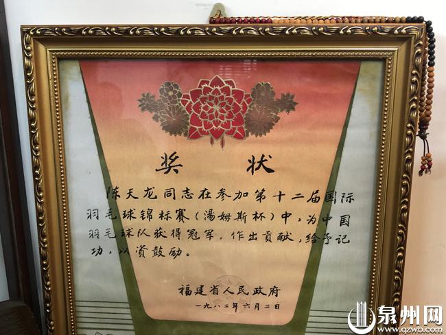 1982年夺得汤杯后,福建省人民政府颁发的奖状。