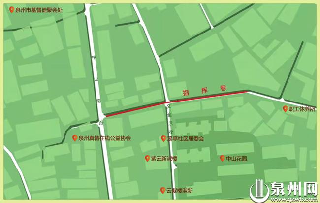 指挥巷位于泉州古城中山南路东侧,东接傅厝巷,与义全后街相交,西抵中山南路,因明代泉州卫的王指挥使衙门设在此,故称指挥巷。指挥巷东段又叫拜袍街,以王指挥使家的对联“赐蟒家声远,拜袍世泽长”命名。