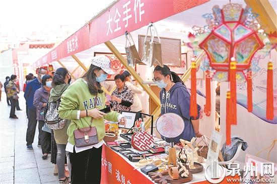 糖画、蒜蓉枝、土笋冻、肉粽,多种“古早味”美食展位一字排开;漆画、锡雕、江加走木偶头、妆糕人、蟳埔女服饰、沉瑜香,各式非遗工艺品琳琅满目……