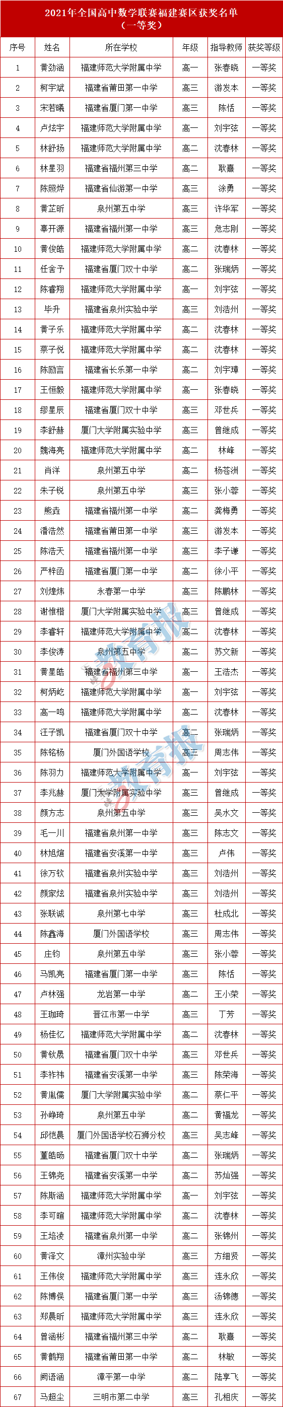 2021年全国高中数学联赛名单福建赛区获奖学生670人!