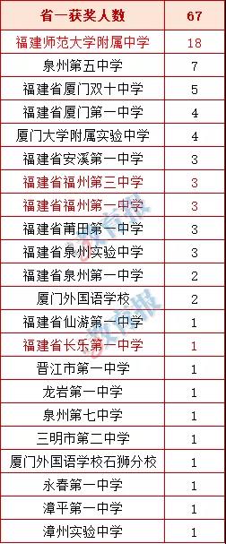 记者统计了获数学“省一”的67人,其中福建师大附中上榜学生18名,人数最多。第二名泉州五中7人,第三名厦门双十5人。
