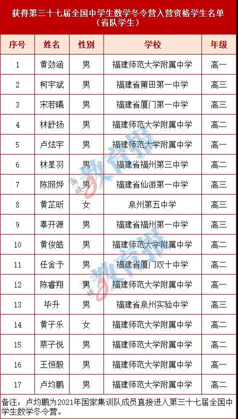 第三十七届全国中学生数学冬令营入营资格学生名单,也就是省队学生共有17人!
