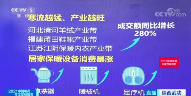 这也带火了相关产品的产业带,比如河北清河羊绒、福建莆田鞋靴、江苏江阴保暖内衣等产业带成交额同比增长280%,“寒潮越猛、产业越旺”。与此同时,居家保暖设备销量暴涨。煮茶器、暖被机、足疗机也让宅在家里的日子既温暖又精致。