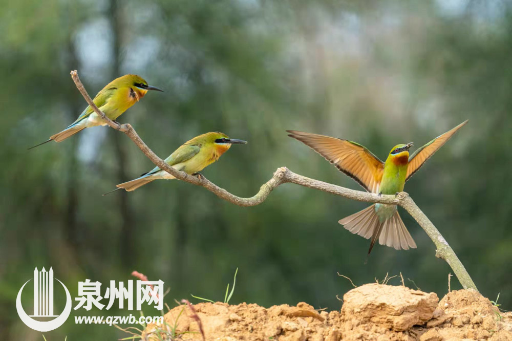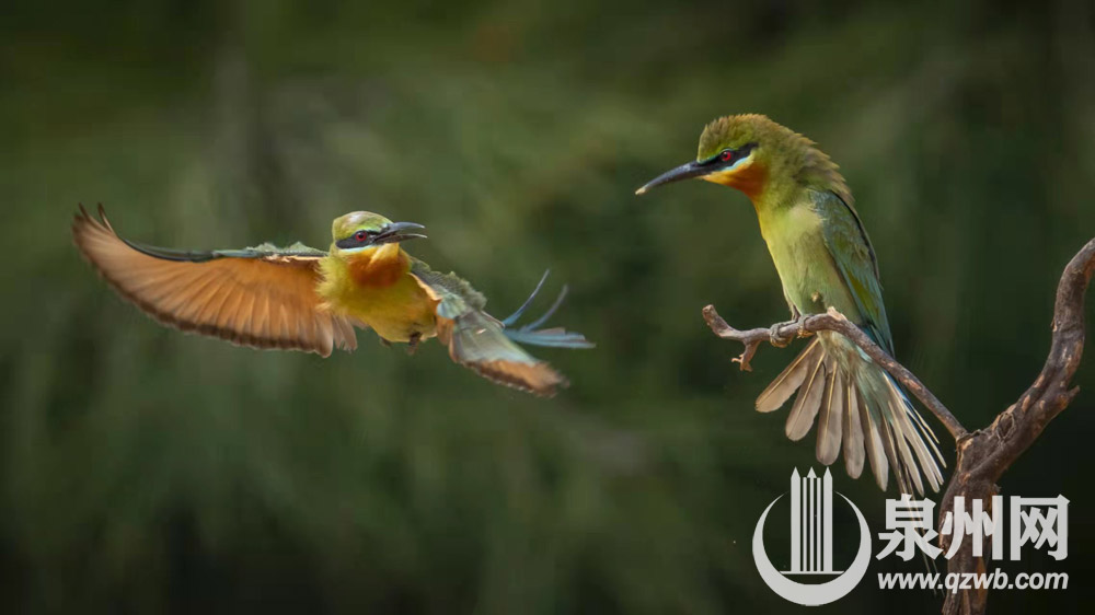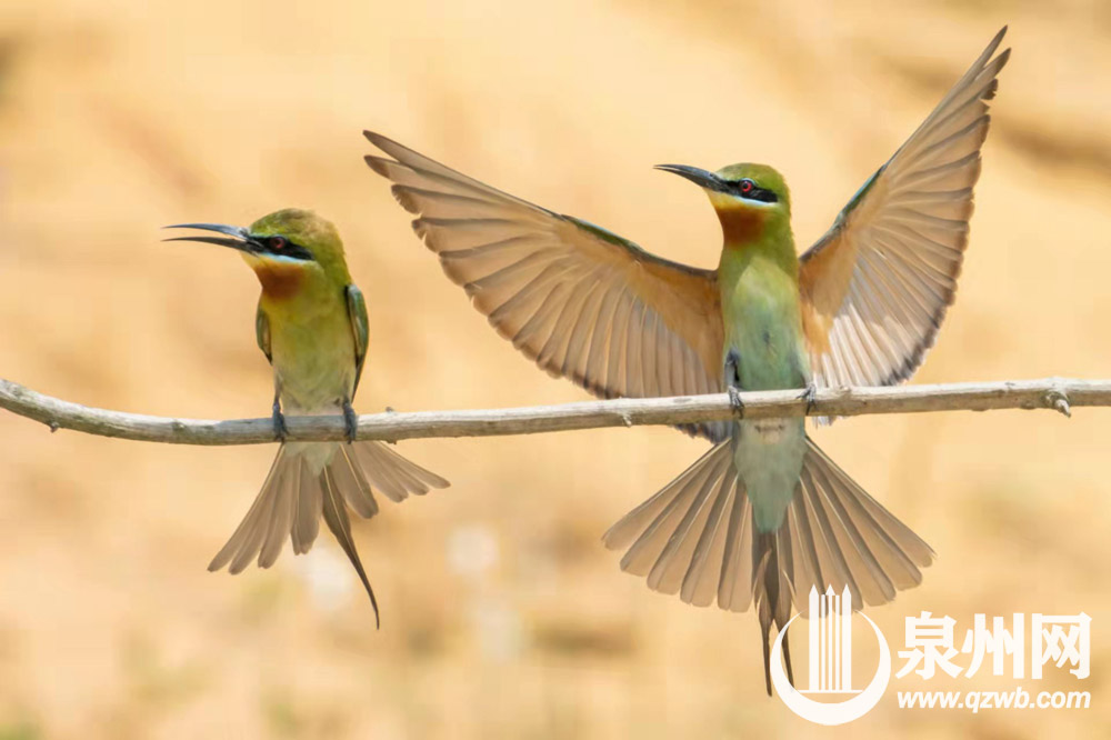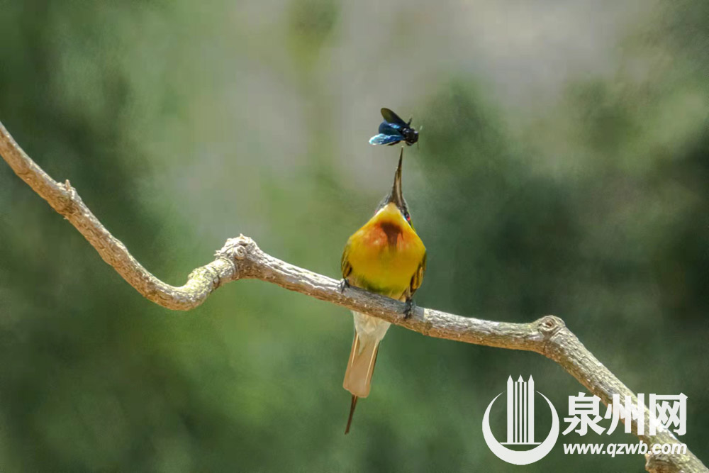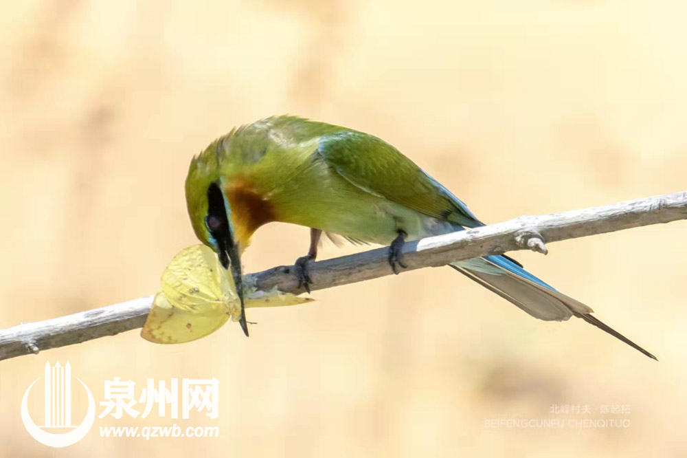 栗喉蜂虎是泉州的夏候鸟,每年4月底5月初来泉州晋江深沪栖息、繁殖,秋末再携子到热带过冬。(陈起拓 摄)