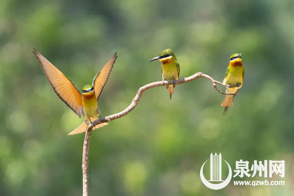 它被誉为中国最美丽的鸟之一,翅膀和背部是绿色的,尾翼蓝色,飞行时翅膀下的羽毛为橙黄色,全身闪烁着艳丽光泽。(陈起拓 摄)