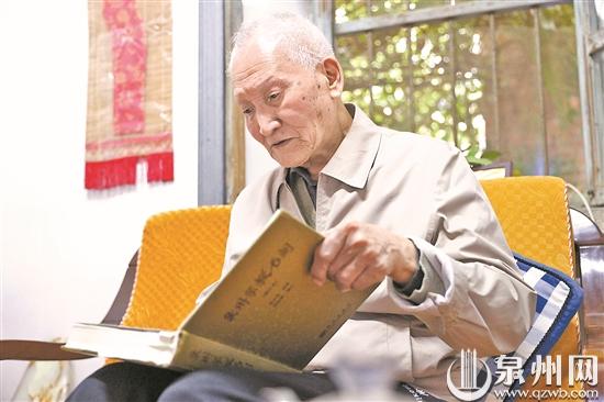 86岁的吴幼雄翻看父子合著的《泉州宗教石刻》增订版