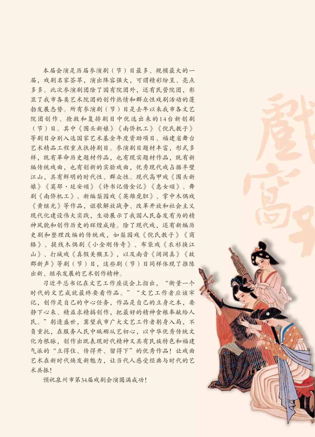 习近平总书记在文艺工作座谈会上指出,“衡量一个时代的文艺成就最终要看作品。”“文艺工作者应该牢记,创作是自己的中心任务,作品是自己的立身之本,要静下心来、精益求精搞创作,把最好的精神食粮奉献给人民。”躬逢盛世,冀望我市广大文艺工作者贯彻落实党的十九届六中全会精神,躬身入局,不负重托,在服务人民中砥砺从艺初心,以中华优秀传统文化为根脉,创作出既表现时代精神又具有民族特色和泉州气派的“立得住、传得开、留得下”的优秀作品,做热“闽南戏窝子”品牌,营造“最闽南”文化空间,为建设海丝名城、智造强市、品质泉州贡献文化力量!让戏曲艺术在新时代焕发新魅力,让当代人感受经典与时代的艺术共振!