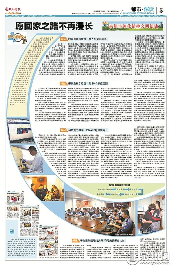 据介绍,为深入推进和组织开展好“团圆”行动,泉州警方注重从全面查找失踪被拐儿童入手,加强对辖区涉拐案件的研判分析,特别是血样生物检材技术的研判比对。针对非亲属落户儿童,以及民政部门福利院、救助机构等公共场所发现的疑似被拐儿童,进行摸排采样,录入打拐系统比对。《泉州晚报》对“团圆”行动取得的成效进行了持续关注与报道。
