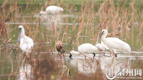 琵琶嘴、黑脸庞、白衣裳……黑脸琵鹭因其扁平如汤匙状的长嘴,与中国乐器琵琶极为相似而得名,亦因其姿态优雅,又被称为“黑面天使”或“黑面舞者”。它们的觅食动作与众不同,长嘴扎在藕田里像扫雷一样来回晃动。省野生动植物保护协会志愿者委员会主任委员、泉州市观鸟学会会长吴轲朝介绍说,黑脸琵鹭是全球濒危珍稀鸟类,被列入《世界自然保护联盟濒危物种红色名录》、中国《国家重点保护野生动物名录》一级,其繁殖地在西伯利亚以及我国辽东半岛一带,泉州湾南岸是其重要的越冬栖息地。