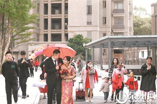 泉州网11月28日讯 (记者吴志明 通讯员谢艳)昨日,一场简朴而不失庄重的婚礼在泉港区峰尾镇诚平村举行。婚礼的主人公是峰尾镇政府的“90后”情侣黄江滨和张佳敏,因为疫情防控需要,他们将原本定于10月3日的婚礼推迟。如今,这场推迟了一个多月的婚礼终于顺利举办,黄江滨也兑现了自己的诺言:“待疫情缓解,让你做最美的新娘。”
