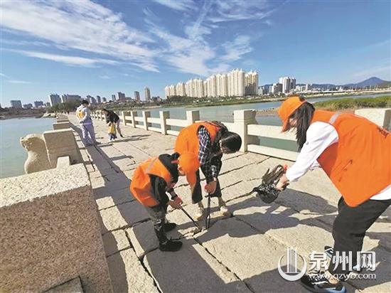 昨日上午9点,杨明燕和其他志愿者就来到洛阳桥。他们手持夹子和环保袋,根据分工仔细地将古桥及周边的烟头和垃圾清除。杨明燕今年43岁,加入志愿服务近十年,经常参与助学、助孤、助残活动。她说:“希望通过我们的志愿活动带动更多的人来保护古桥,爱护我们的文化遗产。”