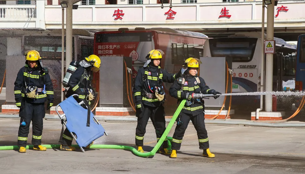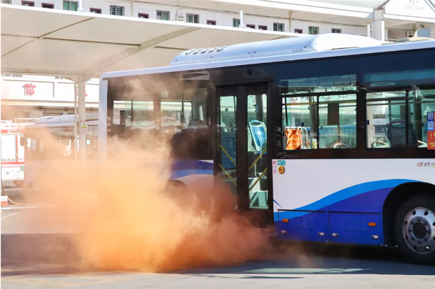 现场模拟了载有乘客的公交车自燃引发的交通事故。随着刺耳的火情警报声响起,只见车辆周围浓烟滚滚,公交公司值班人员迅速报警请求救援。