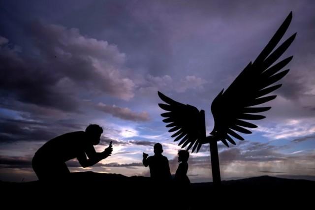 2021年9月19日,在尼加拉瓜首都马那瓜,人们在一座雕像前拍照。(新华社发,戴维·德拉帕斯摄)