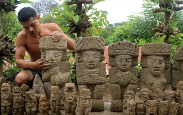 2015年7月6日,尼加拉瓜马萨亚省,一名工匠展示已经雕刻好的石雕作品。(新华社发,约翰·布斯托斯摄)