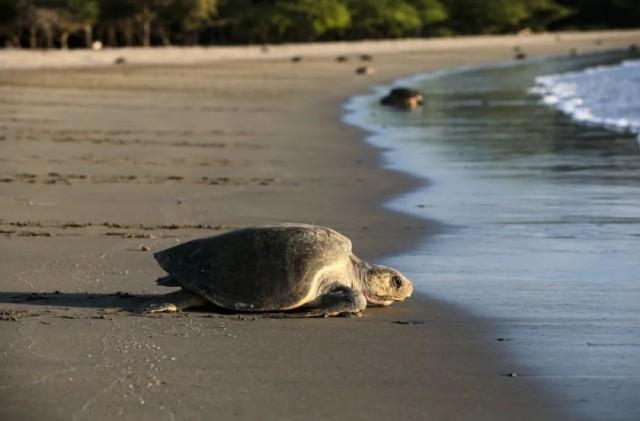 2021年12月5日,一只海龟抵达位于尼加拉瓜南圣胡安湾的拉弗洛尔海滩自然保护区产卵。(新华社发,奥斯瓦尔多·里瓦斯摄)