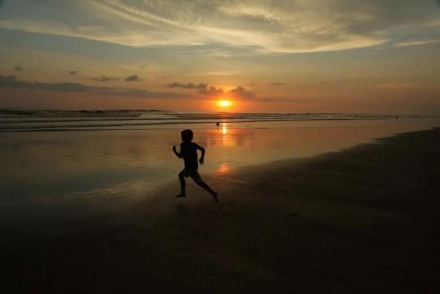 2015年9月28日,一个孩子日落时分在尼加拉瓜南圣拉斐尔市波乔米尔沙滩上奔跑。(新华社发,约翰·布斯托斯摄)