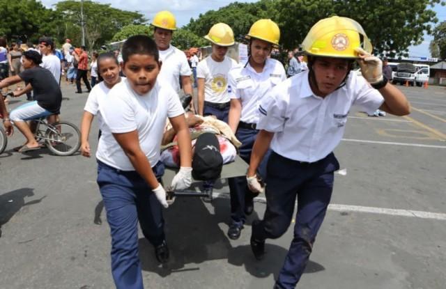 2015年9月22日,尼加拉瓜首都马那瓜,几名小学生在消防员指导下参与地震救援演习。(新华社发,约翰·布斯托斯摄)