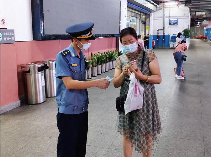 在泉州晋江国际机场地下停车场,交通执法人员向乘客发放“温馨服务卡”。(泉州市交通执法支队供图)