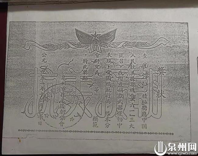 1951年泉州市抗美援朝分会给倪添江颁发的奖状(倪东乔/供图)