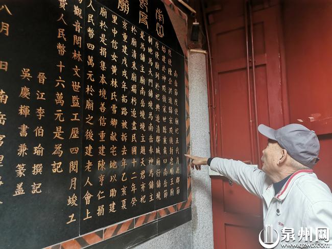王建成介绍南岳宫的重建碑记,上面记载南岳宫在1958年因拓路被拆,由城南舶司库巷的书法家李伯瑜撰记。