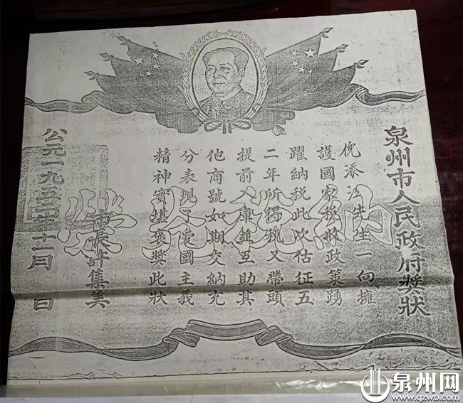 1952年泉州市政府为倪添江颁发的纳税奖状(倪东乔/供图)