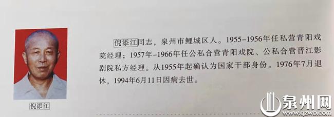 据晋江大剧院(原晋江影剧院)经理杨水声介绍, 1954年,倪添江的益新文具行与晋江青阳华联商号合资,在晋江青阳沿塘头始建“青阳戏院“,1955年1月正式营业,当时有940个座位。1957年,青阳戏院改名为成公私合营青阳戏院,后又改名为公私合营晋江影剧院、晋江大剧院。倪添江以私方最大股东身份,于1955年-1956年任私营青阳戏院经理,1957年-1966年任公私合营青阳戏院、公私合营晋江影剧院私方经理,1976年退休。
