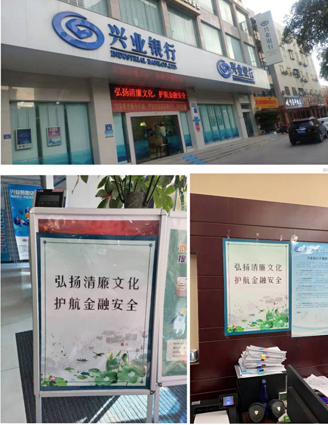 为深入贯彻落实福建银保监局《福建银行业保险业清廉金融文化宣传周活动方案》、泉州市银行业协会、泉州市保险业协会《关于转发福建省银行业协会、福建省保险业协会开展2021年福建银行业保险业清廉金融文化宣教活动的通知》等文件精神,兴业银行泉州分行于2021年12月6日-12日深入开展2021年清廉金融文化宣传教育周活动。