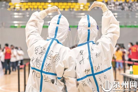 市儿童医院儿科护士林小霞到老家泉港峰尾镇奎璧村开展核酸采样,为不影响工作,她到了家门口却不敢与亲人打招呼;泉州市第一医院呼吸与危重症医学科护士庄阿琼也是泉港人,到山腰镇锦绣广场核酸采样时,同样不敢让亲戚、同学认出。为了抗击疫情,泉港界山派出所民警林欣推迟与爱人的订婚仪式,同事吕志康与辅警潘金宝也推迟了婚礼。记者获悉,林欣和吕志康都获推荐参评泉港区抗疫先进个人,吕志康与潘金宝计划于明年1月份结婚。