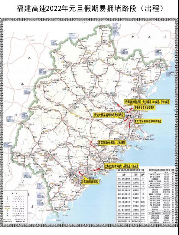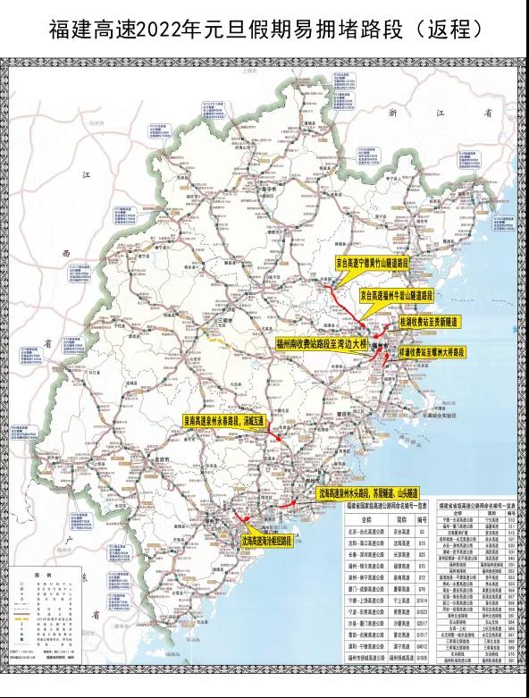 预计福建省高速公路2021年12月31日18时至20时,2022年1月1日8时至11时出程车流增大,2021年1月3日16时至20时返程车流增大。