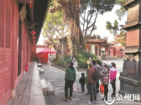 当天,开元寺也有公益讲解服务。游客从拜亭开始出发,公益讲解员一路讲解开元寺的历史、文化内涵等。有了讲解服务,游客不再是随意逛逛、拍几张照片的走马观花之游。“游起来多了许多乐趣。”张女士说,她与男朋友从龙岩来泉州旅游,公益讲解让他们对泉州的人文地理知识有了更深入的了解。