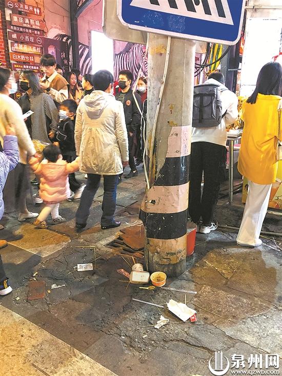 1日傍晚6时许,夜幕降临,华灯初上,记者沿中心市区中山路和西街漫步。此时中山路人流量较大,路面整体整洁,只有个别角落能看到零星的纸屑等垃圾。再从钟楼沿西街向西走,此时西街游人如织。在小吃店密集区域,可见地上散落着白色口罩、纸巾、塑料袋、长竹签和烟头等垃圾。部分街边角落成为临时“垃圾堆放点”,如裴巷巷口一电线杆旁堆放着餐盒、筷子、竹签等垃圾。距离一垃圾桶不到10米远处,有数十根竹签和垃圾袋被丢在地上。记者也看到,大多数游客都能文明游玩,有的游客吃完小吃后,将成把的竹签抓在手中,走到垃圾桶处丢弃;一对带着孩子的夫妻则将所有垃圾装在一塑料袋里,边走边逛,遇到垃圾桶再丢掉,通过言传身教引导孩子爱护城市环境。