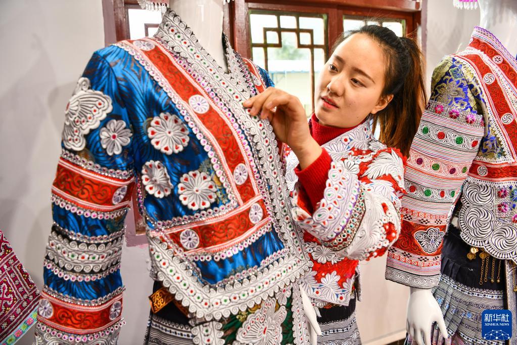 在贵州省毕节市黔西县新仁苗族乡化屋村麻窝寨易地扶贫搬迁集中安置点,苗族绣娘杨文丽整理苗族服饰(2021年2月20日摄)。新华社记者 杨文斌 摄