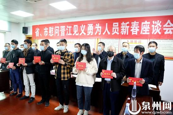 在上午举行的新春座谈会上,傅镛堃一行共为慰问晋江市历年来受省市两级表彰的见义勇为英模及牺牲勇士家属91人,发放慰问金135800元。傅镛堃勉励各位见义勇为勇士及其家属要传承传统、珍惜荣誉、不忘初心、自强自立,要坚定理想信念,永葆英雄本色。
