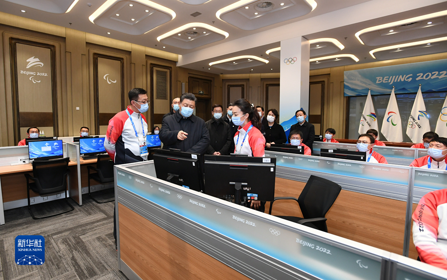 1月4日,中共中央总书记、国家主席、中央军委主席习近平在北京考察2022年冬奥会、冬残奥会筹办备赛工作。这是4日下午,习近平在北京冬奥运行指挥部调度中心考察。新华社记者 谢环驰 摄