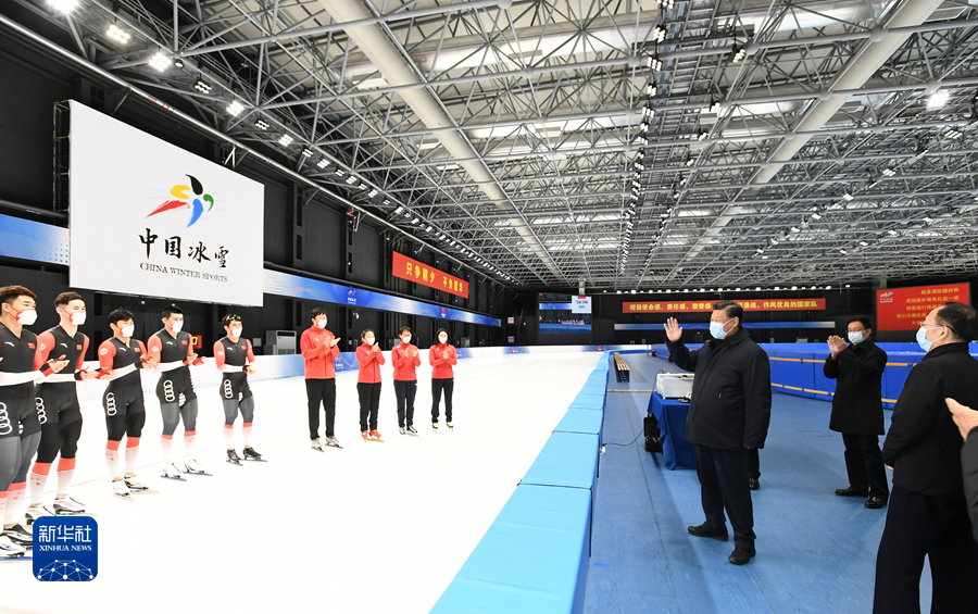 1月4日,中共中央总书记、国家主席、中央军委主席习近平在北京考察2022年冬奥会、冬残奥会筹办备赛工作。这是4日下午,习近平在二七厂冰雪项目训练基地速滑馆,向参训运动员、教练员表示慰问。新华社记者 谢环驰 摄