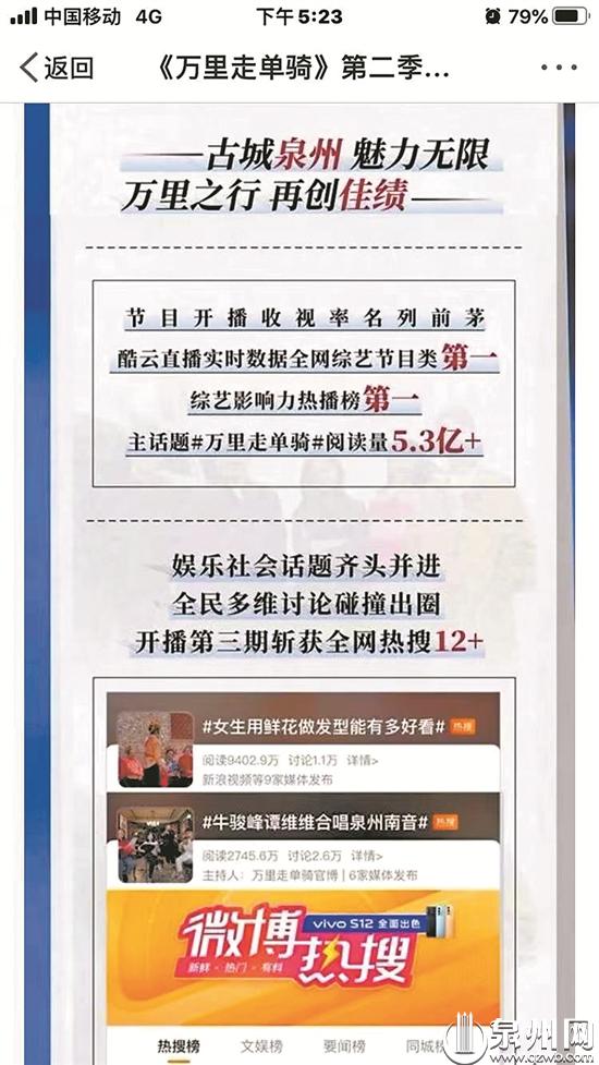 今年1月2日,在浙江卫视播出的世界遗产揭秘互动纪实文化类节目《万里走单骑》第二季的第三期中,“万里少年团”单霁翔、周韵、肖央、牛骏峰和飞行嘉宾谭维维来到泉州,探寻这座世遗城市的“前世今生”,感受“活态古城”的文化传承。节目播出后,相关话题#女生用鲜花做发型能有多好看#、#牛骏峰谭维维合唱泉州南音#登上微博热搜,引发讨论,成为热议话题。主话题#万里走单骑#也登上微博综艺影响力榜单第一名。