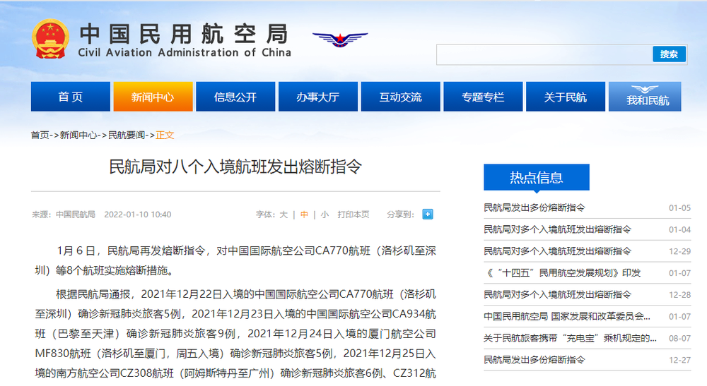 1月6日,民航局再发熔断指令,对中国国际航空公司CA770航班(洛杉矶至深圳)等8个航班实施熔断措施。