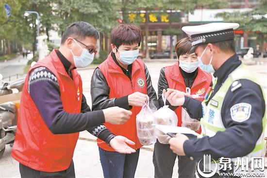 为将这一份特殊的温暖送到仍在岗位上坚守的劳动者,志愿者们专门打包了上百份腊八粥。在丰泽街与田安路岗亭执勤的丰泽交警大队二中队的黄警官接过腊八粥后,向志愿者们表示感谢。昨日正值第二个“中国人民警察节”,黄警官感慨道:“腊八节巧遇警察节,在这样特殊的日子里,能够吃到这一份热腾腾的腊八粥,很温暖,也很感动。”