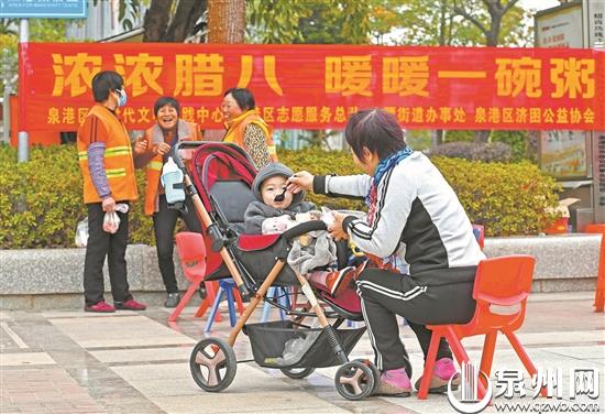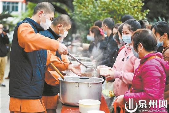泉州网1月11日讯 “腊八到,粥飘香。”腊月里天寒地冻,来一碗热腾腾的腊八粥,暖身又暖心。昨日是农历腊月初八,我市各地自发为群众赠送腊八粥。腊八节拉开了过年的序幕,喝着寓意吉祥如意的腊八粥,年味也越来越浓了。