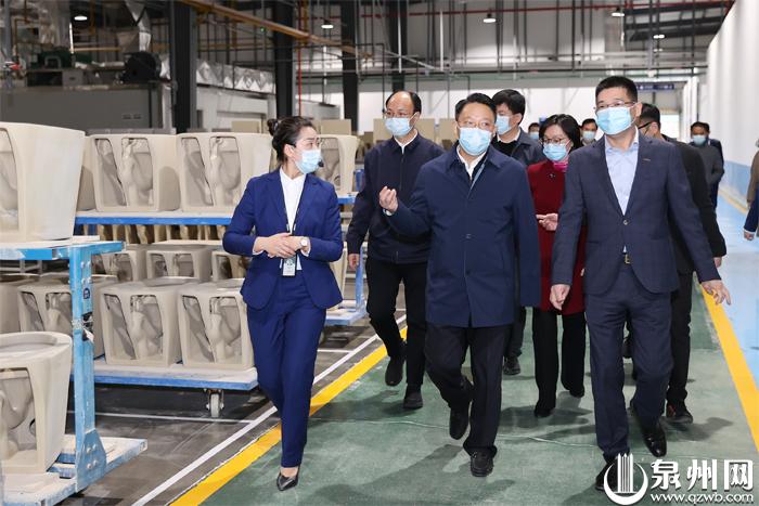 12日,省委常委、市委书记刘建洋前往永春县调研,图为他在九牧永春智慧制造产业园了解智慧陶瓷工厂生产、管理、创新等情况。