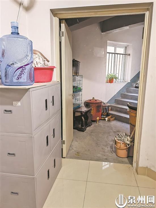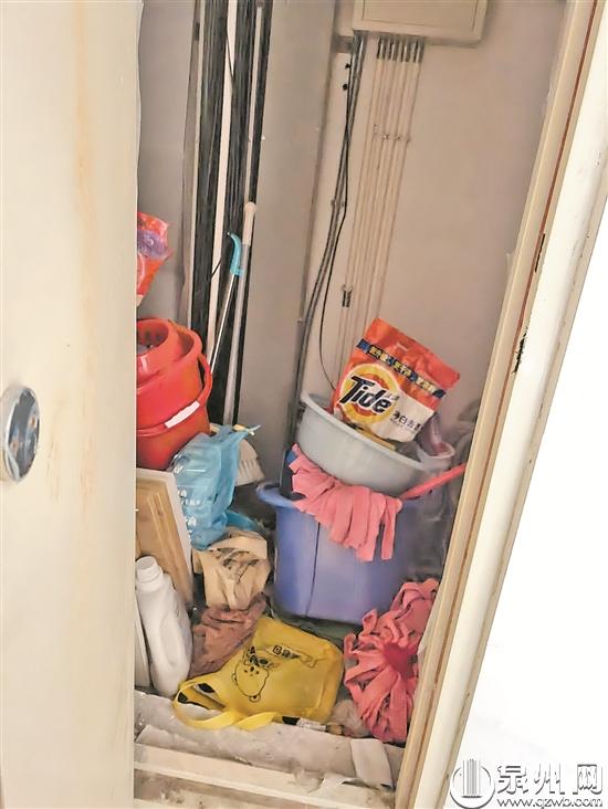 记者走访发现,周边多个小区的楼梯通道堆有杂物,甚至还有弱电间内堆放杂物的现象。草埕花园11号楼504室被改造成了5间房,大门需要刷卡进出。站在房屋门口,记者看到门边的弱电间开着,里面堆放了拖把、脸盆、水管等可燃物,存在消防安全隐患。