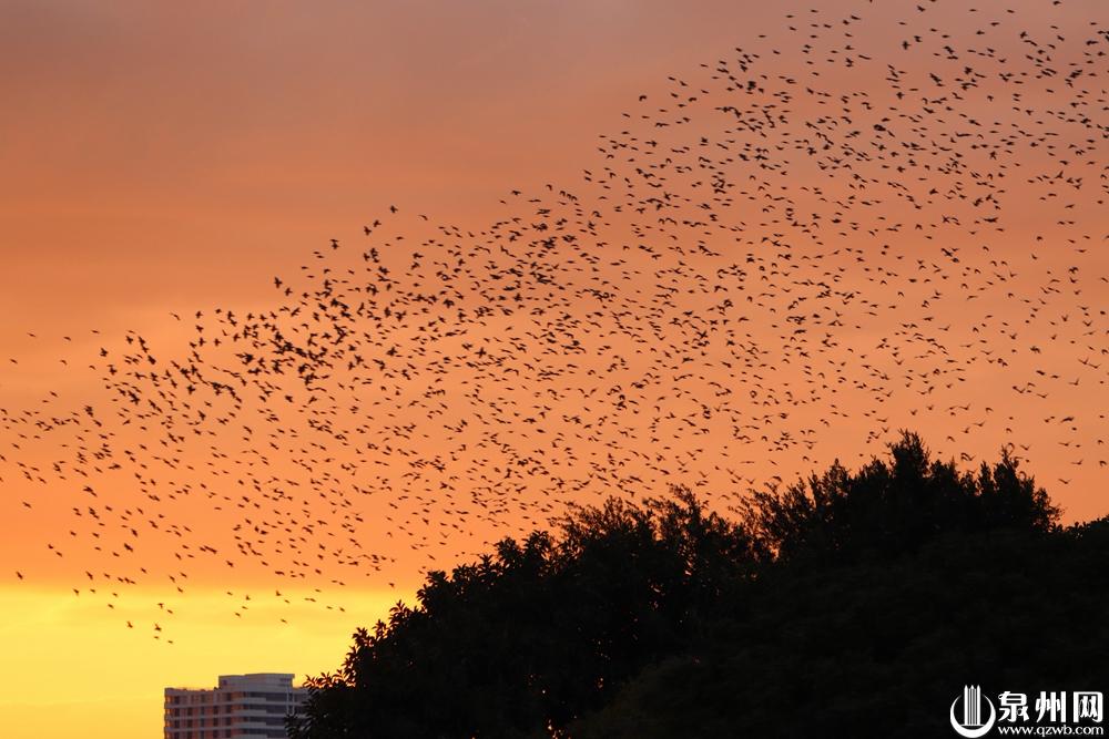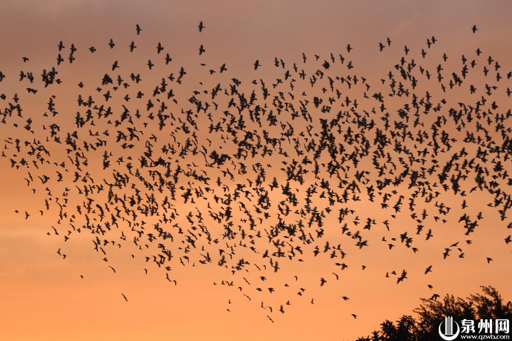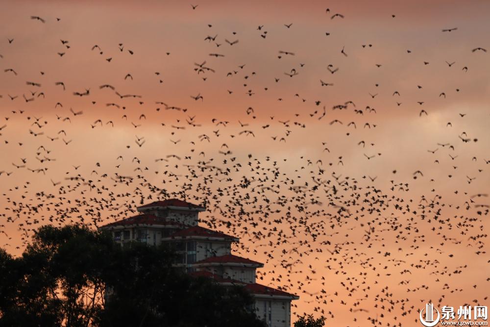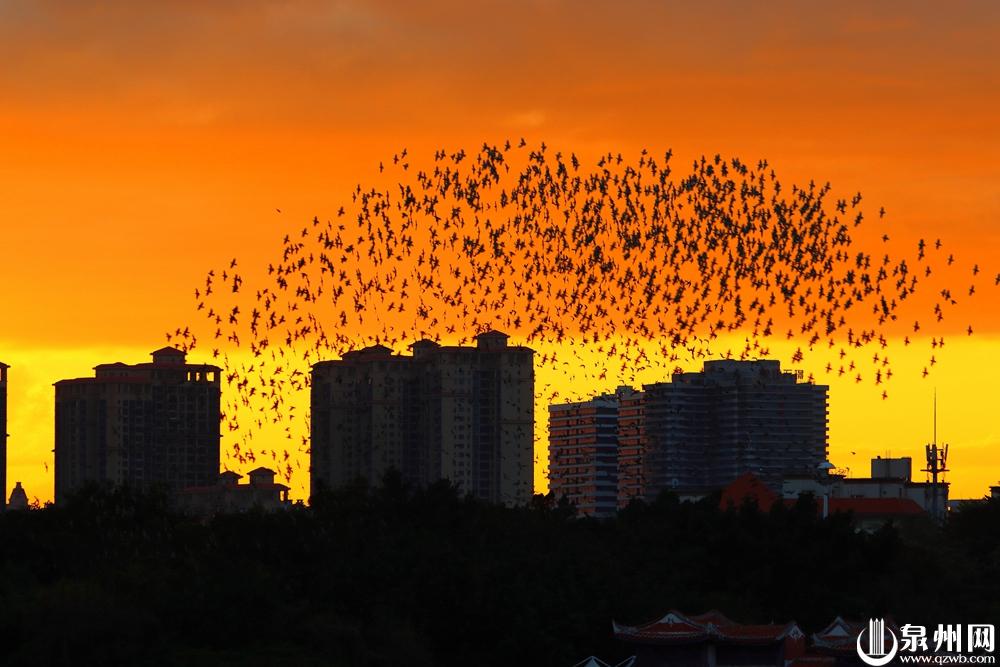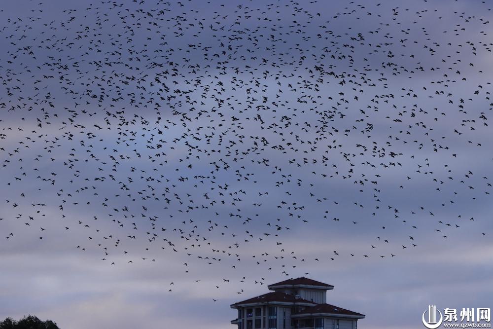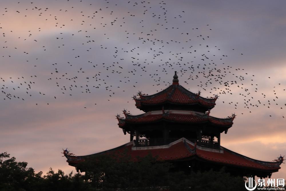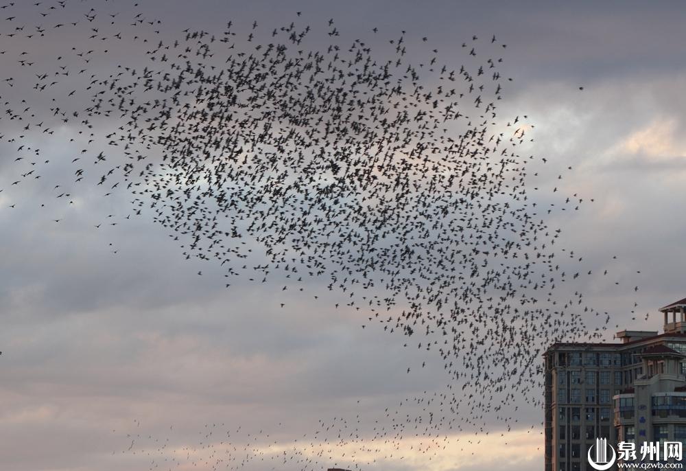在泉州西湖公园桃花岛边上的刺桐阁,天空上惊现很多鸟儿在空中盘旋、嬉戏,摆出不同“阵型”,仿佛在进行一场盛大的狂欢。(曾东平 摄)