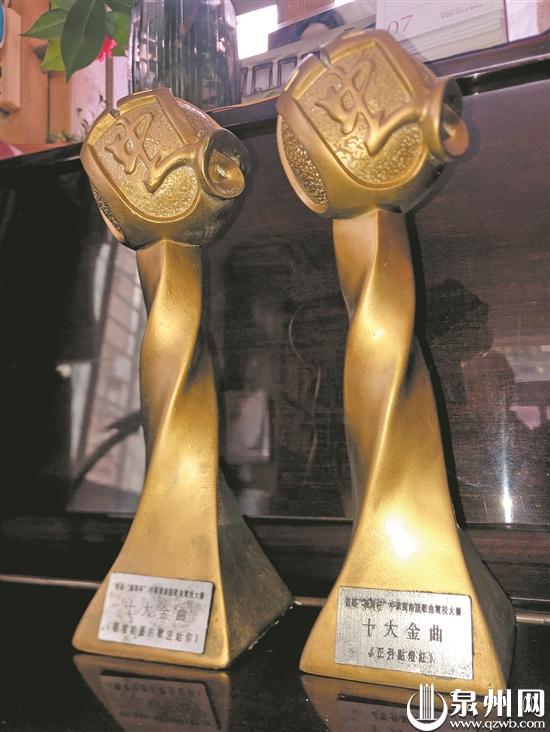 创作的歌曲《唱块咱厝的歌送给你》《正月点灯红》获2005年首届“施琅杯”中华闽南语歌曲电视大赛十大金曲奖,此为奖杯。(林达鑫 翻拍)