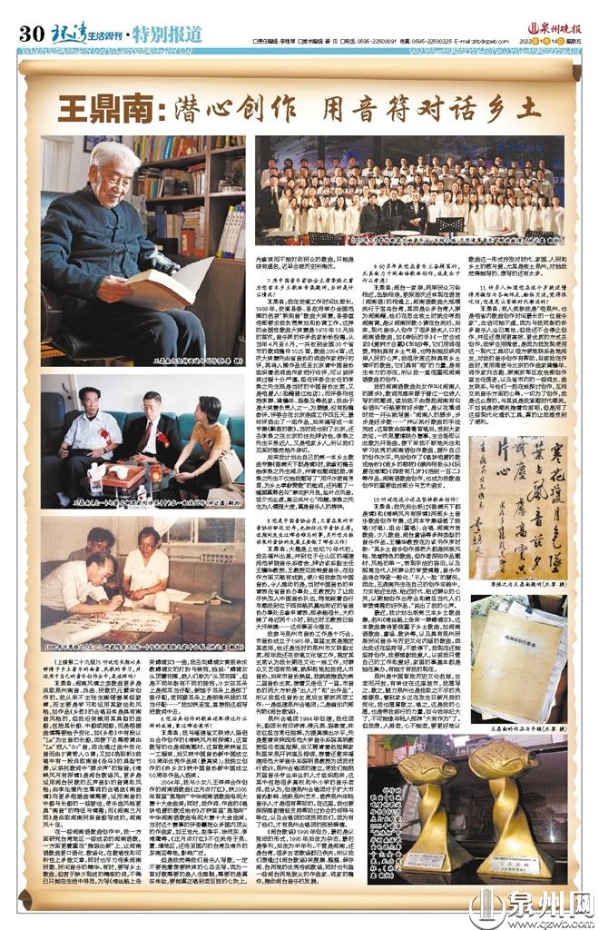 王鼎南:我先后出版过《香满天下都是情》和《海峡风月有深情》两部乡土音乐歌曲创作专集,这两本专集涵盖了独唱(对唱)、组合(重唱)、合唱、闽南方言歌曲、少儿歌曲、闽台童谣等多种类型的音乐作品。王耀华教授在为该书作序时称:“其乡土音乐创作虽然大都是民族风格、地域特色的歌曲,但作者深知作品题材、风格的单一,表现手法的陈旧,以及脱离当代人民群众的审美情趣,音乐作品将会导致一般化、‘千人一脸’的窘况。因此,王鼎南先生在自己的创作实践中,力求贴近生活、贴近时代、贴近群众的心灵,以期能创作出符合和满足当代人们审美情趣的好作品。”说出了我的心声。