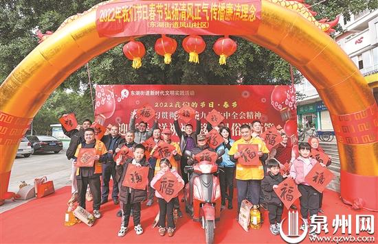 当天,“2022年我们的节日·春节”丰泽区新时代文明实践活动“迎新春送祝福 移风易俗谱新篇”在凤山社区举行。文艺工作者和志愿者带来喜庆吉祥的歌舞,多名书法家现场为居民写春联。春联内容各异,其中“福”字备受居民喜爱。“一两个小时写了上百个‘福’字。”社区工作人员介绍。