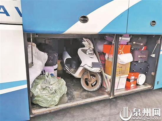 昨日上午10时许,在晋江牛山高速春运交通安全督察点,执勤人员对一辆鄂Q牌照的大客车进行例行的安全检查。大客车下层行李舱打开,除了行李,里面赫然停放着一辆白色摩托车。