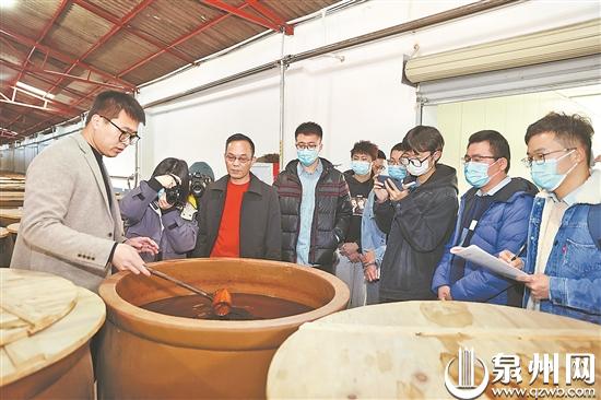 采访团走进永春达埔镇东园村得壹醋业生产车间,挖掘乡村产业发展典型。(张九强 摄)