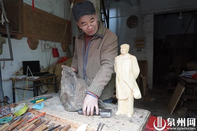 伍堡街185号,陈德仁师傅和老伴在大门口摆着工作台,整天在这里忙活雕刻。十多年前,老陈两口子从浙江东阳来到泉州,带着传统的东阳木雕手艺,开了这间“东阳木雕美工坊”,如今在伍堡街已颇有名气。