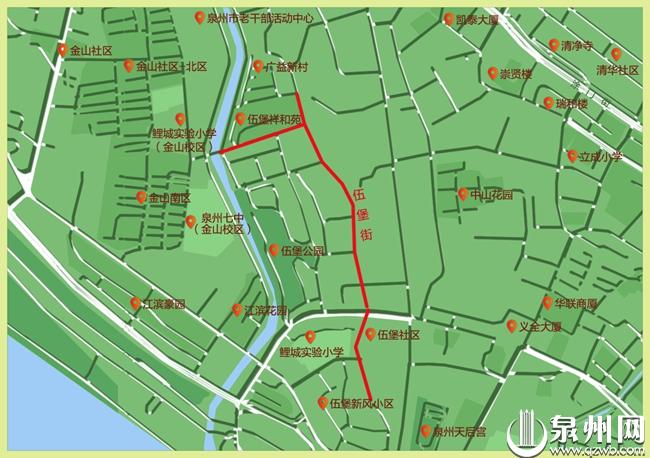 伍堡街位于泉州鲤城区伍堡社区,南接土地后巷,北抵四堡街,北段向西延伸至笋浯溪上的金宝桥,因位于泉州城墙的第五堡,故称伍堡街。泉州城南曾有一堡至五堡,其中二堡在历史演变中范围逐渐变小,在多年前门牌更新时只剩两三户人家,已全部并入三堡。