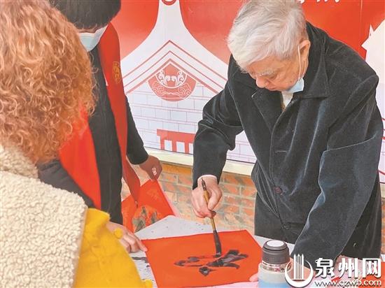 临近春节,为丰富辖区居民群众的精神文化生活,鲤城临江街道伍堡社区在伍堡公园开展“佳节尚文明 志愿关爱行”新春送“福”文化文艺志愿服务活动,现场除了精彩的文艺表演,还有书法爱好者写春联,免费送给居民。(王丽虹 黄雅龄 摄)